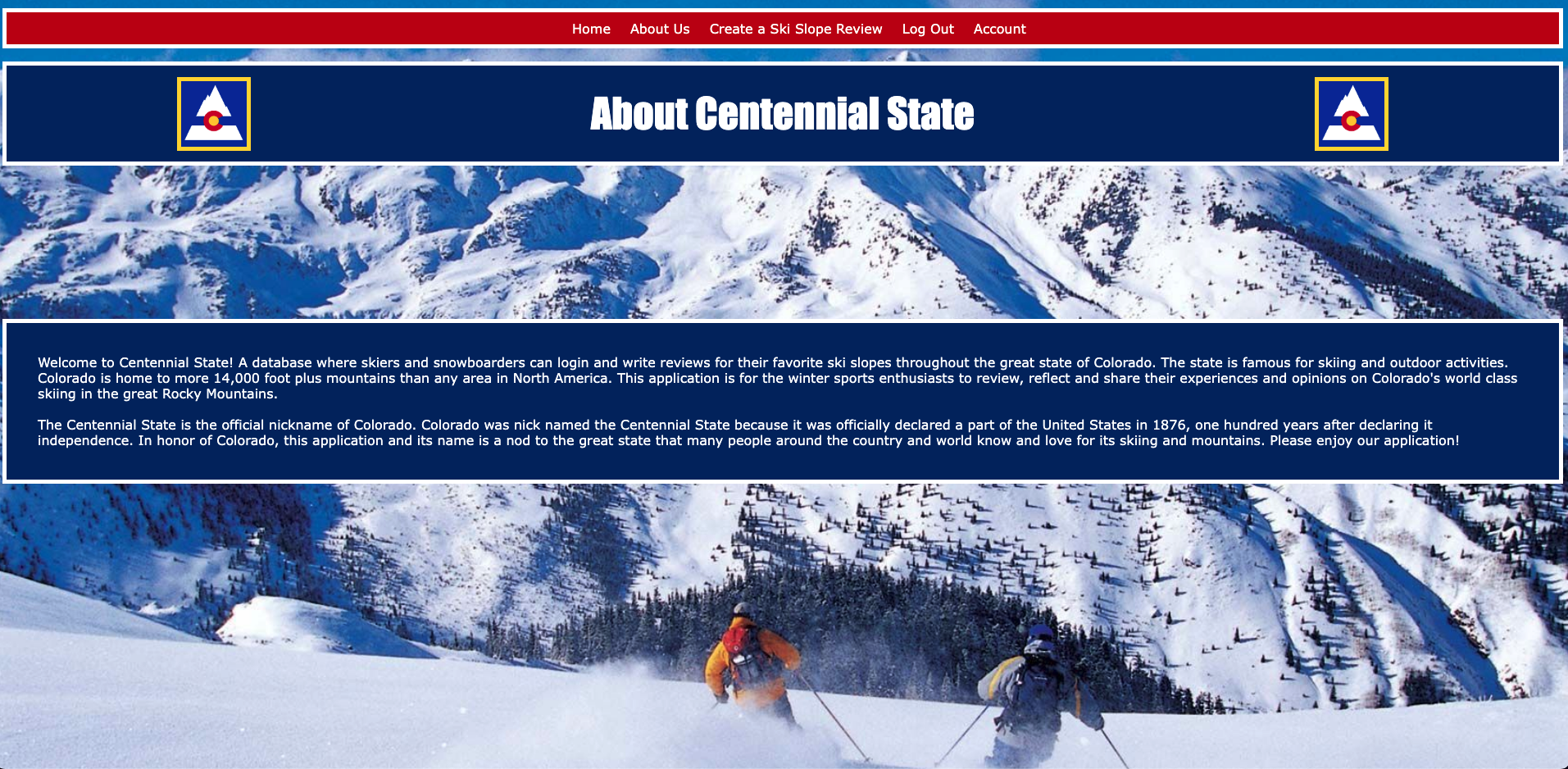 Centennial State is a Flask Jinja application where skiers and snowboarders can login and write reviews for their favorite ski slopes throughout the great state of Colorado. This application is for the winter sports enthusiasts to review, reflect and share their experiences and opinions on Colorado's world class skiing.